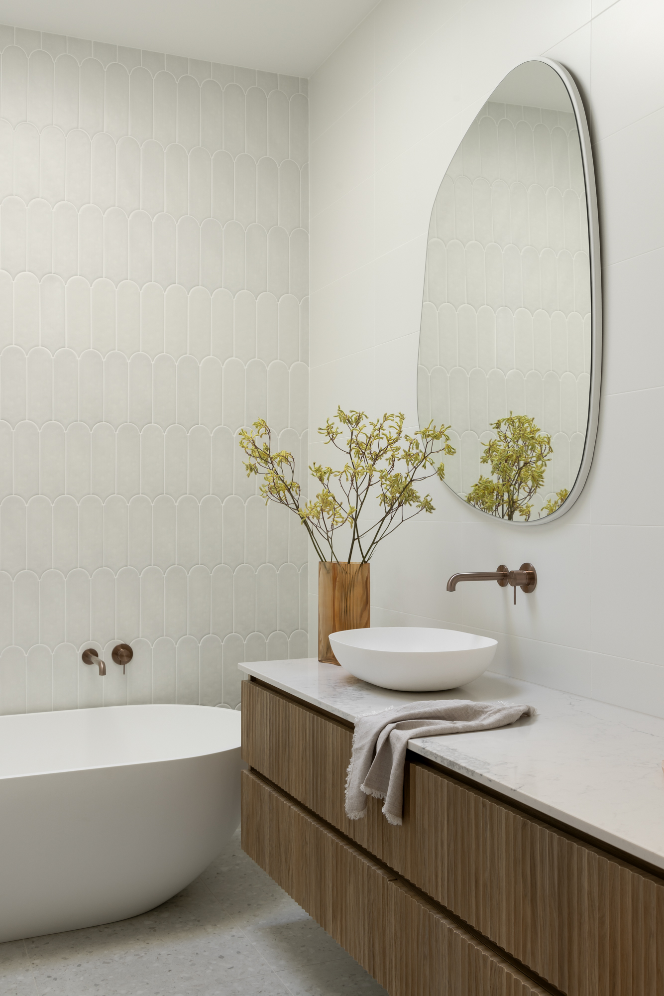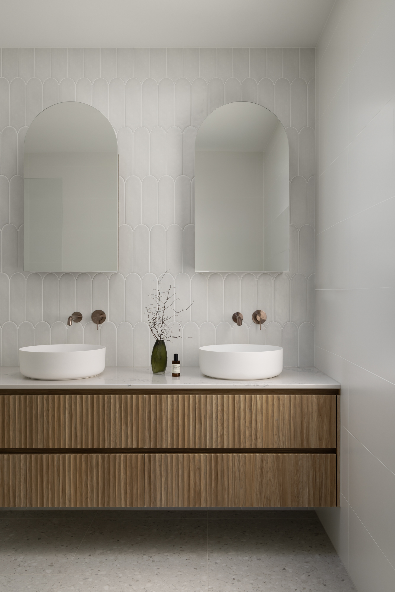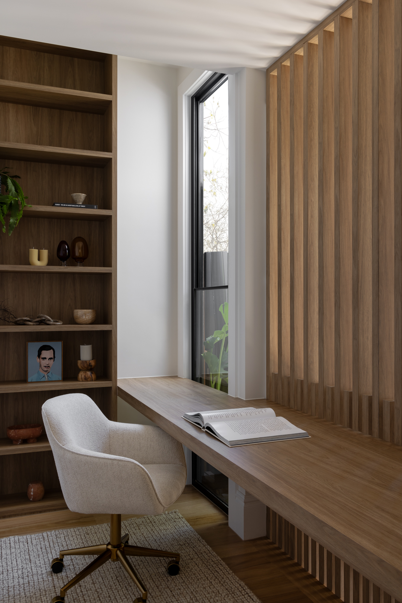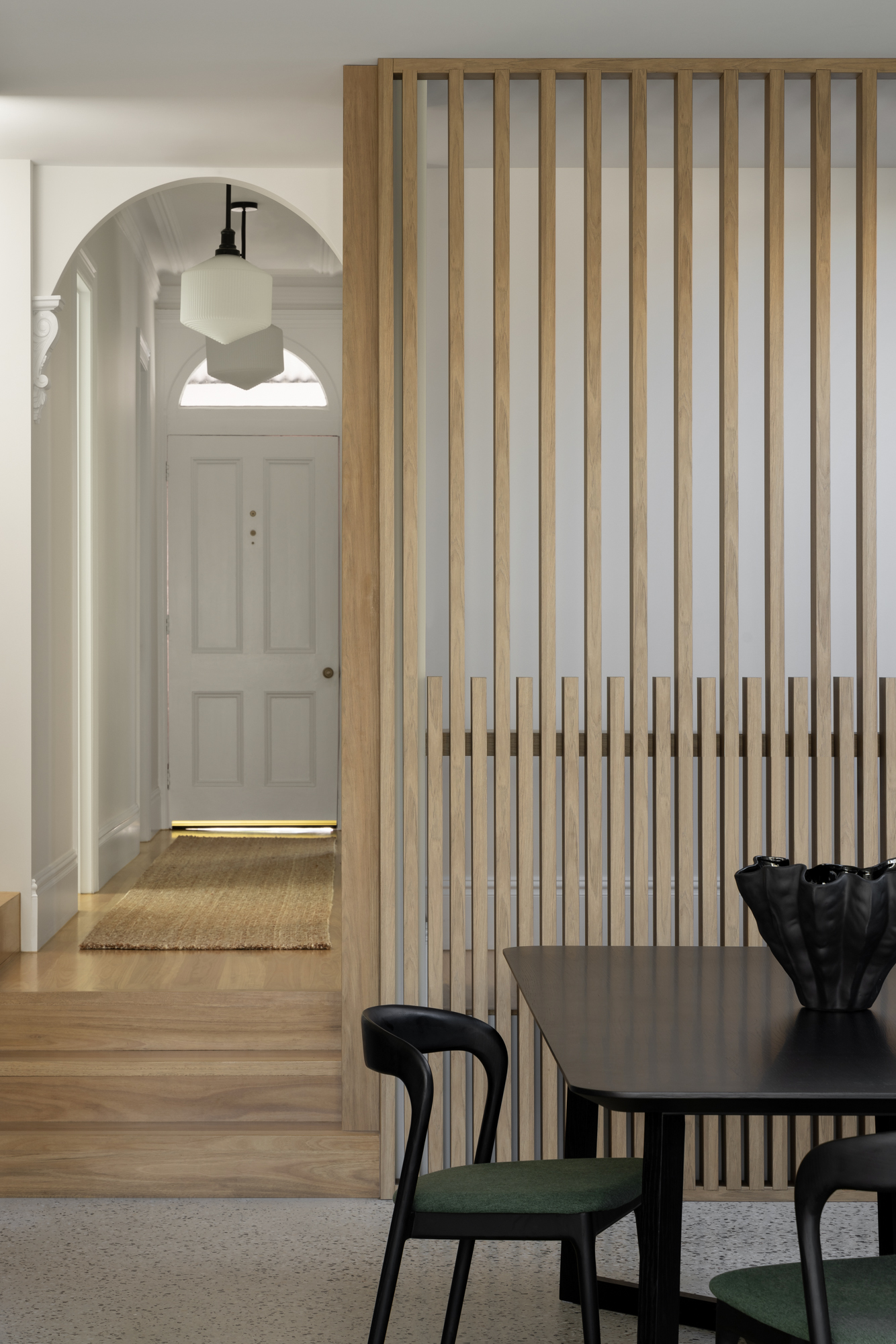 In startling contrast to the original single-story heritage frontage, the first-floor rear extension is curved to provide a sculptural design feature when viewed from the rear yard. The elegant curve is formed with thin vertical strips of timber inset with a large louvred viewing window. The placement and design minimise overshadowing of the neighbouring property and provide an elegant entrance to the rear first-floor bedroom.