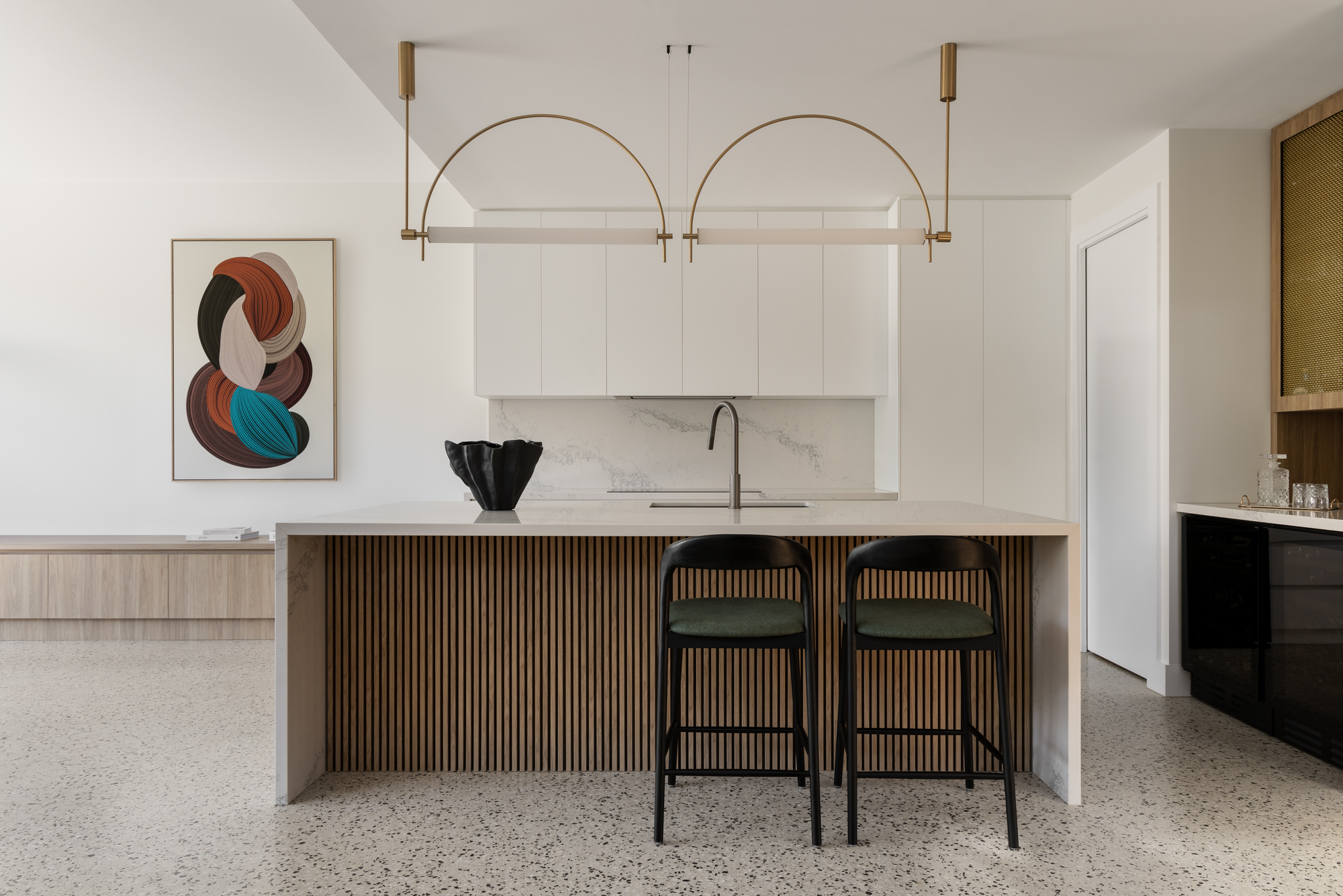 This provided an ideal transition point between the existing heritage building and the stylish rear extension. Stepping down from the old home into a new open plan living area facilitated high ceilings with large expanses of glazing. This further integrated with outdoor entertaining areas and allowed for views over the pool and rear yard.